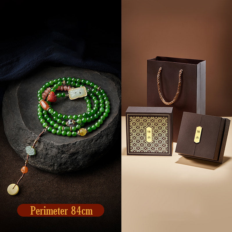 The necklace measures 33.07 inches (approx. 84 cm) in perimeter, with various bead sizes like 6mm cyan jade beads and 8mm red agate Buddha head beads. This length allows for flexible wearing as a bracelet or necklace to suit your style.
