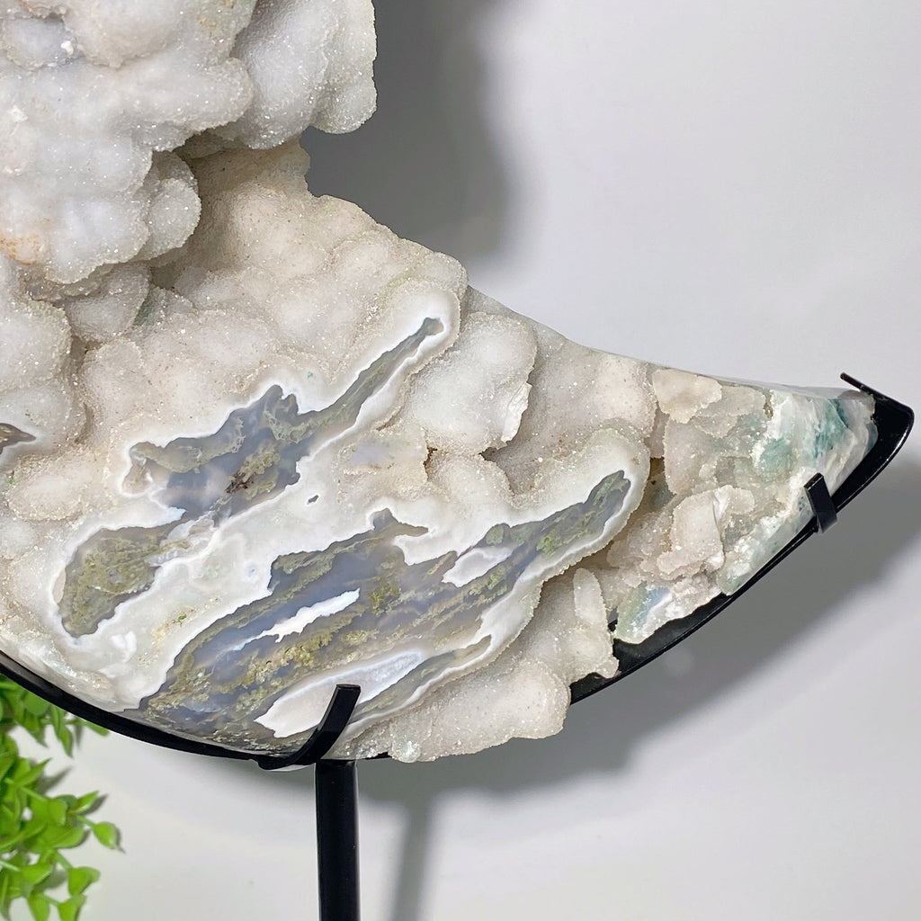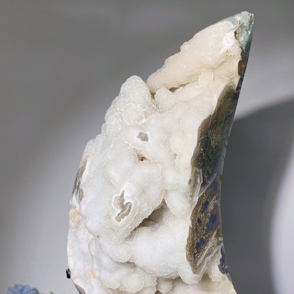 The druzy moss agate moon carving promotes emotional balance and spiritual growth. Known for its nurturing energy, it helps to harmonize your inner self and environment, making it a beautiful tool for meditation and healing rituals.
