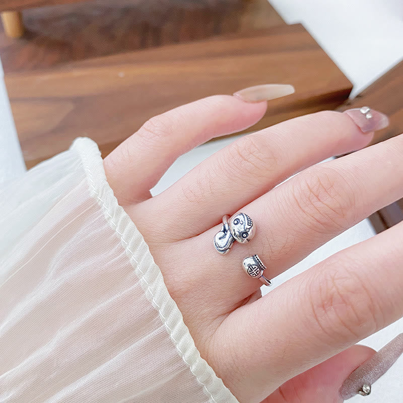 This beautiful ring features a unique open design with a charming snake on one end and a lucky pouch on the other. It's crafted from high-quality 925 sterling silver and is adjustable to fit most finger sizes, offering both comfort and spiritual significance.