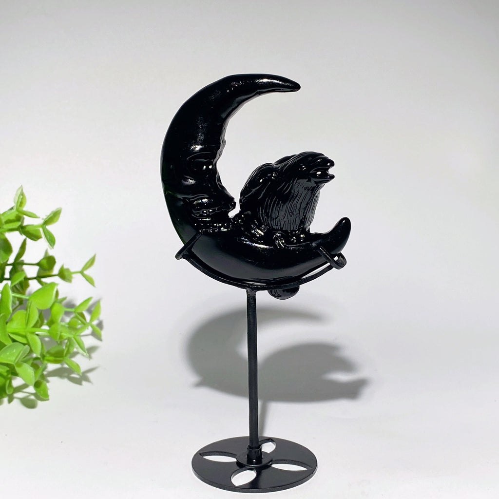 The moon and raven carving measures approximately 3.3 inches (approx. 8.38 cm) in length, and it comes with a stand that is about 3.2 inches (approx. 8.13 cm) tall, making it a perfect size for desktop or altar display.