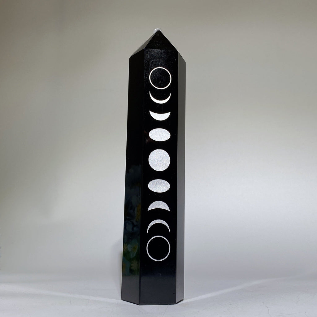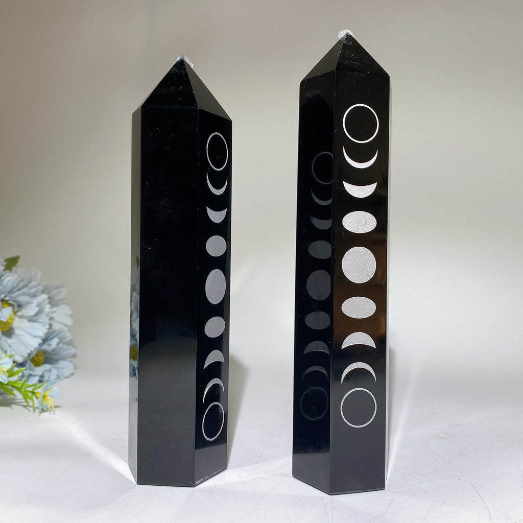 This black obsidian tower is prized for its powerful grounding and protective energies. The silver moon printing enhances its connection to lunar cycles, aiding meditation, emotional balance, and spiritual growth.