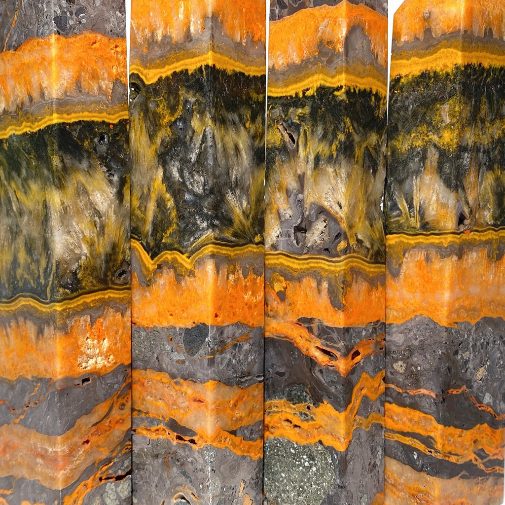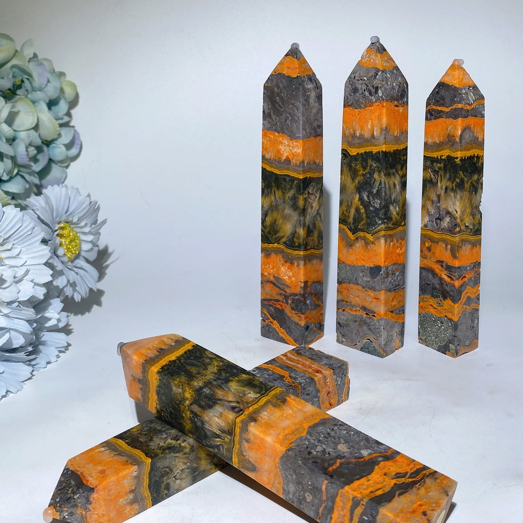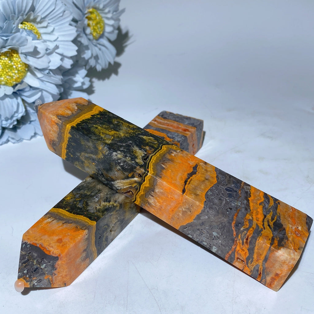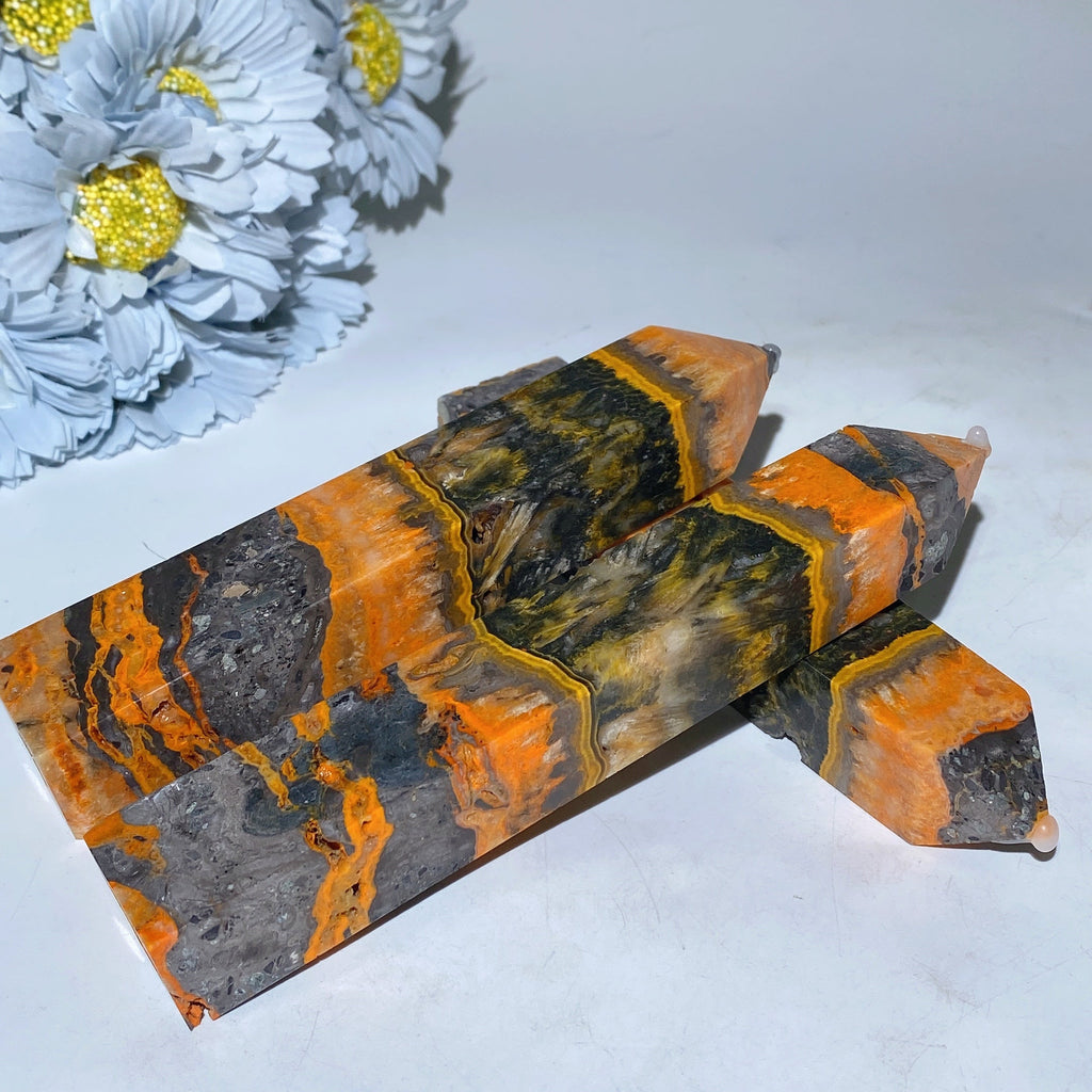 The bumblebee jasper tower is known for its energizing and balancing properties. It helps stimulate creativity, increase focus, and promote positivity, making it ideal for meditation and spiritual work.
