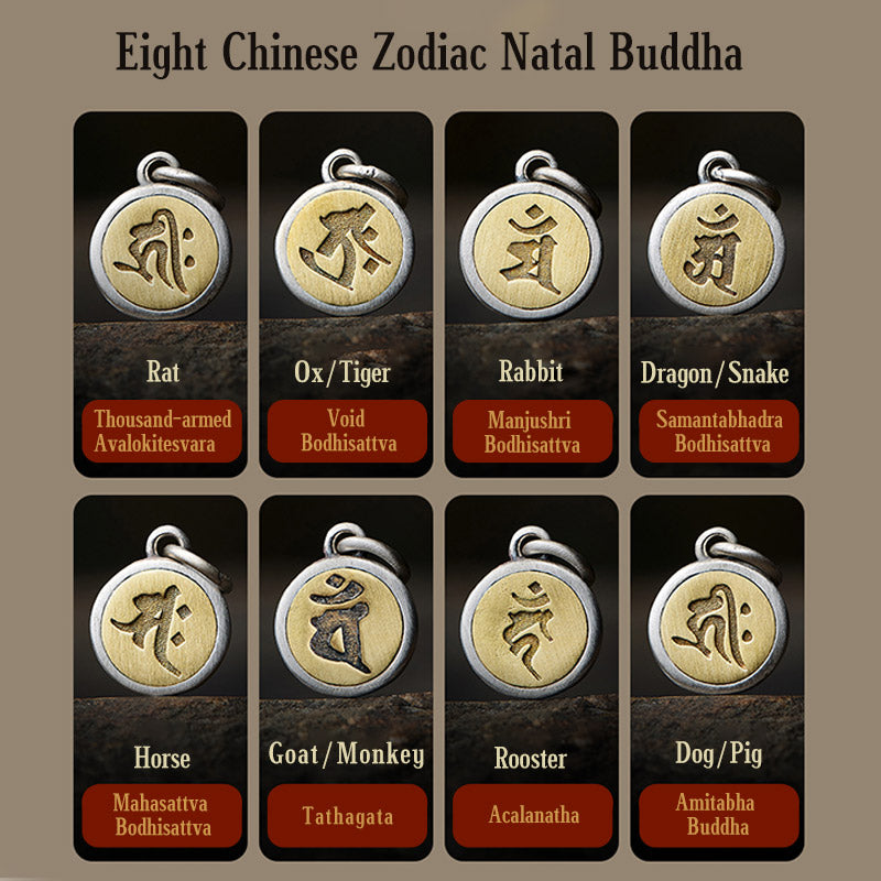 Each variant features symbolism specific to one of the zodiac animals, with designs including Rat (Thousand-armed Avalokitesvara), Ox/Tiger (Void Bodhisattva), Rabbit (Manjushri Bodhisattva), Dragon/Snake (Samantabhadra Bodhisattva), Horse (Mahasattva Bodhisattva), Goat/Monkey (Tathagata), Rooster (Acalanatha), and Dog/Pig (Amitabha Buddha).
