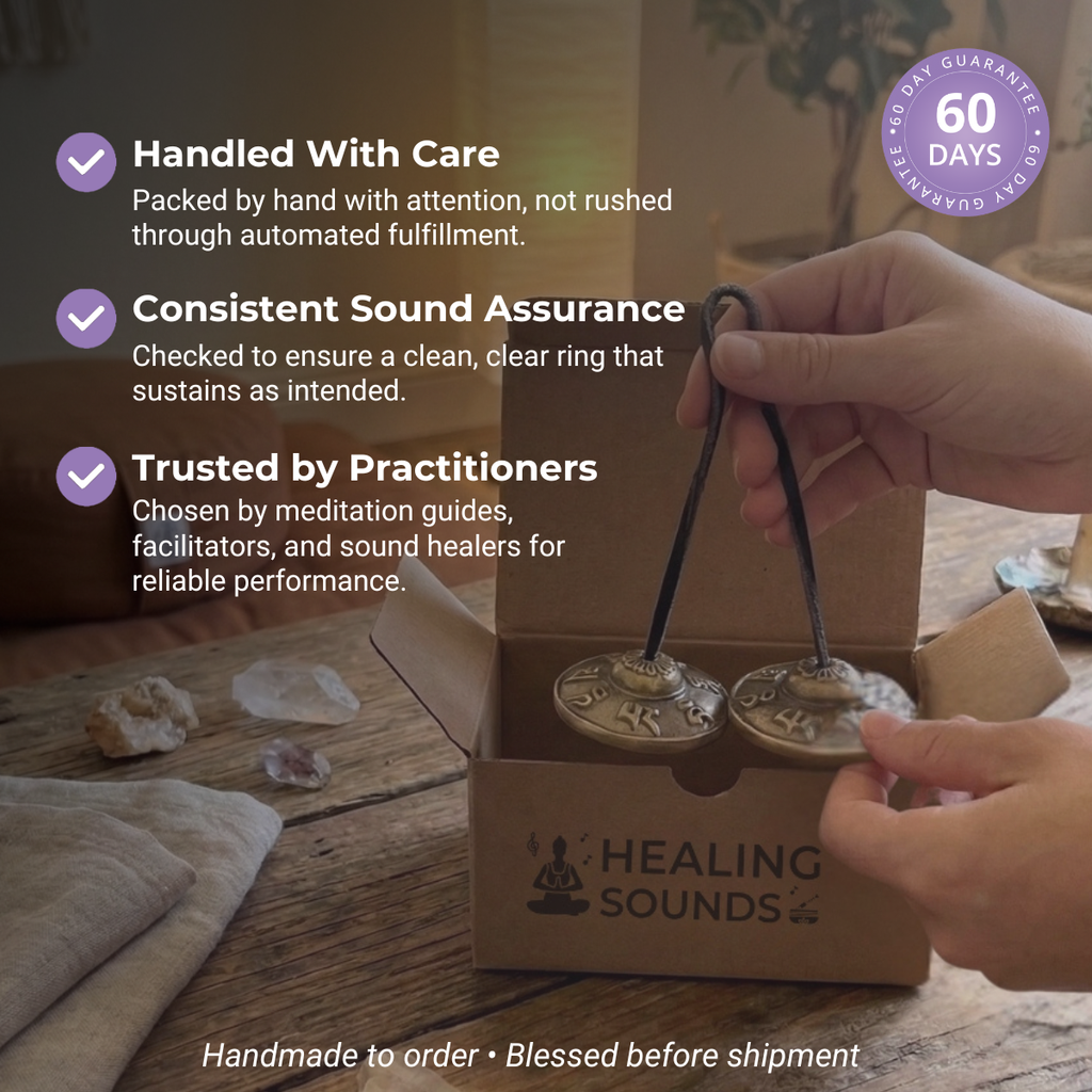 Remove the bells before sleeping or washing to preserve their energy. Clean them gently with a soft, dry cloth and keep them stored in the included bag to protect from damage and maintain their spiritual power.