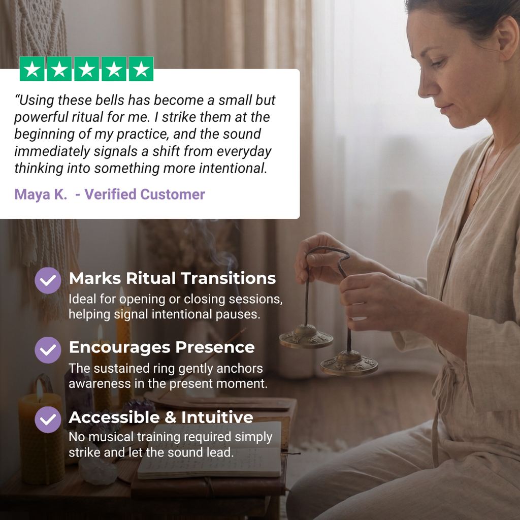 Hold the Tingsha Bells by their strap and gently strike the two cymbals together. Focus on their clear, long-lasting tone to center your mind. You can also spin them after striking to disperse sound and clear your space energetically.