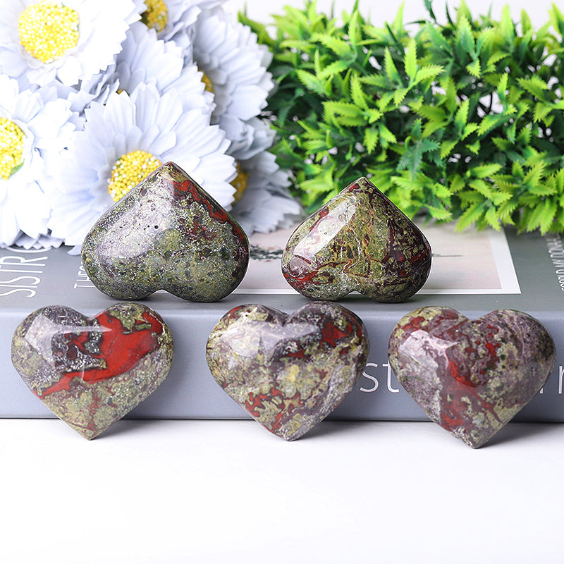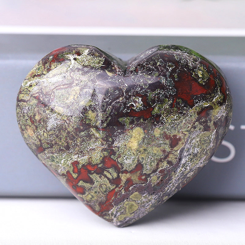 The Dragon Blood Stone heart crystal is known for its ability to promote emotional healing, balance energy, and strengthen courage. Its unique blend of deep green and red tones enhances harmony and spiritual growth, making it a wonderful companion for your meditation or heart chakra work.