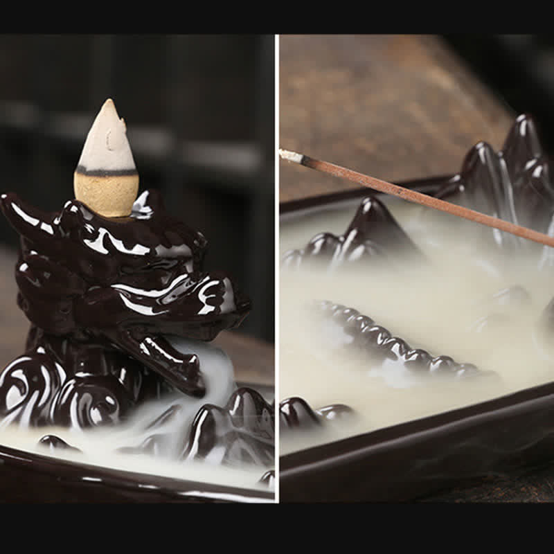 The flowing design of our Mountain Dragon burner connects you to elemental energies—earth represented by the ceramic material, fire through the burning incense, air through the smoke, and water through the flowing cascade effect of the smoke's path.