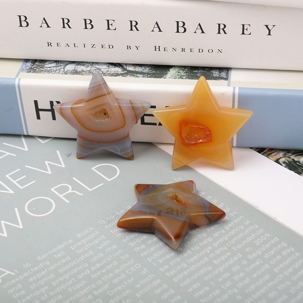 Invite celestial energy into your sacred space with this Set of 3 Druzy Agate 2-Inch Star Carvings for Healing. These beautiful star shaped crystals harness the natural power and beauty of druzy agate, meticulously carved into perfect five-pointed stars. Each piece in this set of crystal stars showcases the stone's unique banding patterns in warm orange, earthy brown, and soft gray tones.