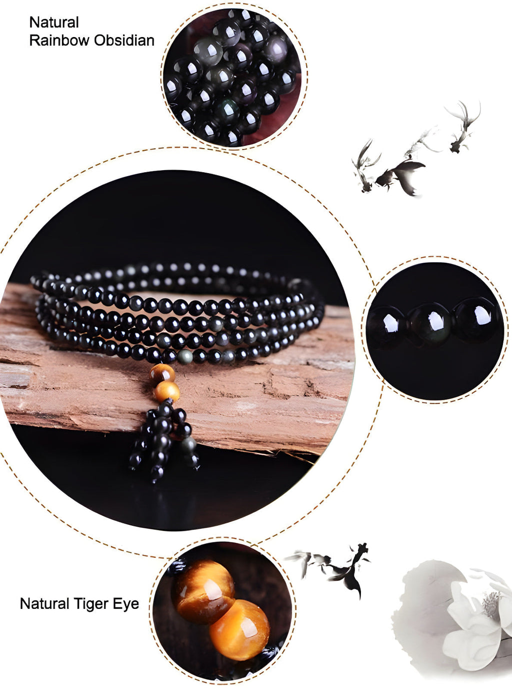 Bead Count: 216 beads (approximately 200 Rainbow Obsidian, 14 Black Obsidian, and 2 Tiger Eye)