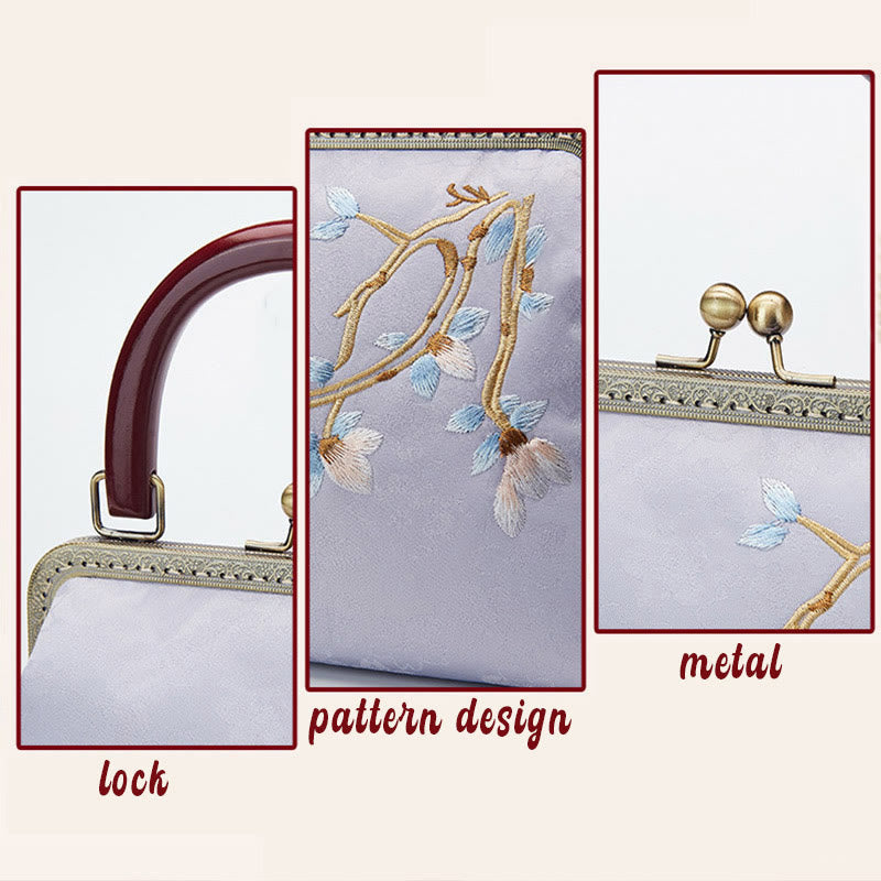 The flower embroidery handbag features traditional Chinese motifs symbolizing beauty, harmony, and tranquility. Its design reflects timeless spiritual values, making it a meaningful accessory to carry positive energy throughout your day.