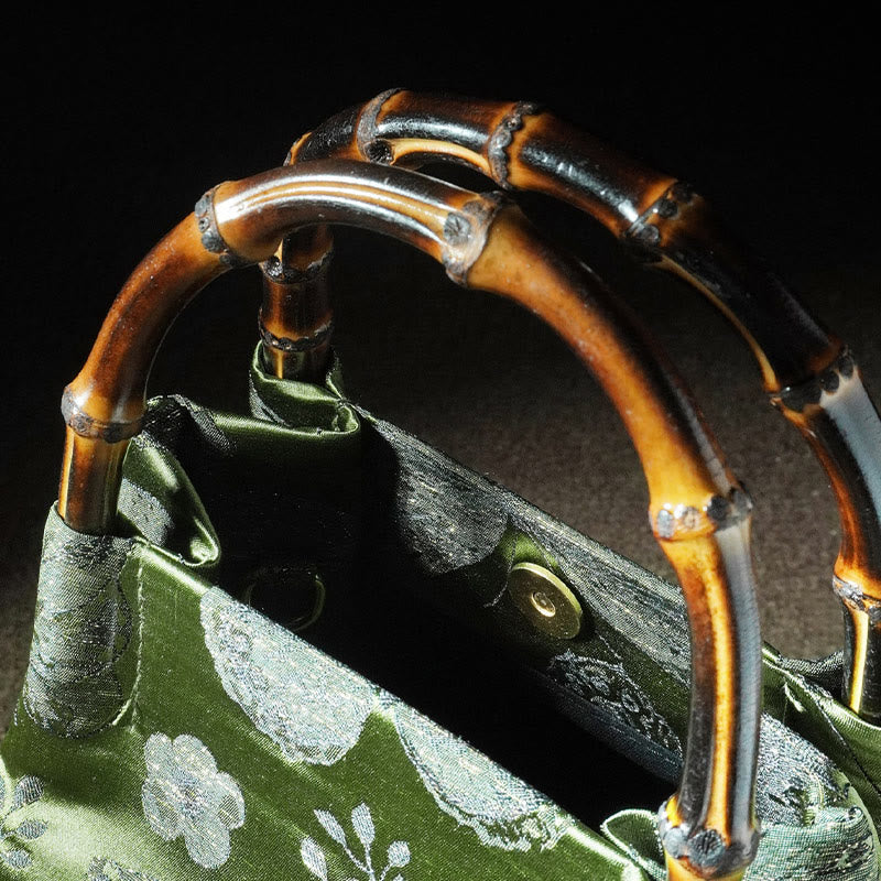 This handbag is crafted with durable polyester fabric, a sturdy bamboo handle, and a metal chain strap. These natural and metal elements blend for both style and lasting quality.