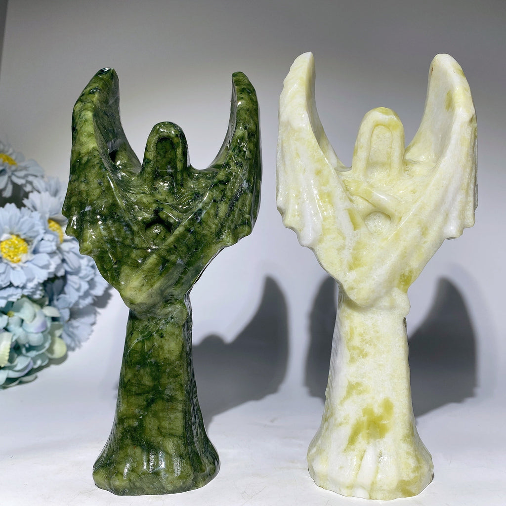 - Hand-carved detailed angelic figure with wings and raised arms