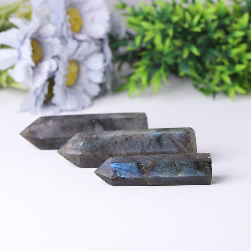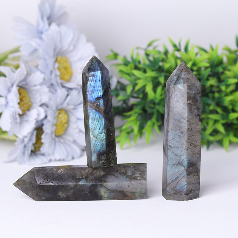 Each Labradorite tower is unique; colors may vary slightly with blue and green iridescent flashes. All pieces are natural and selected carefully for quality and energy.