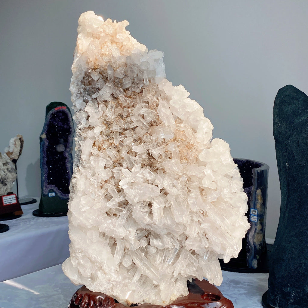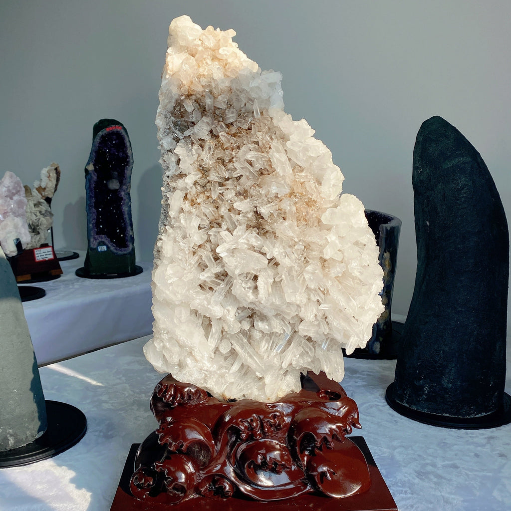 This large calcite cluster is prized for its powerful healing properties, including cleansing negative energies, enhancing mental clarity, and uplifting spiritual awareness. Its natural crystalline formation amplifies positive vibrations, making it a centerpiece for meditation or energy work.