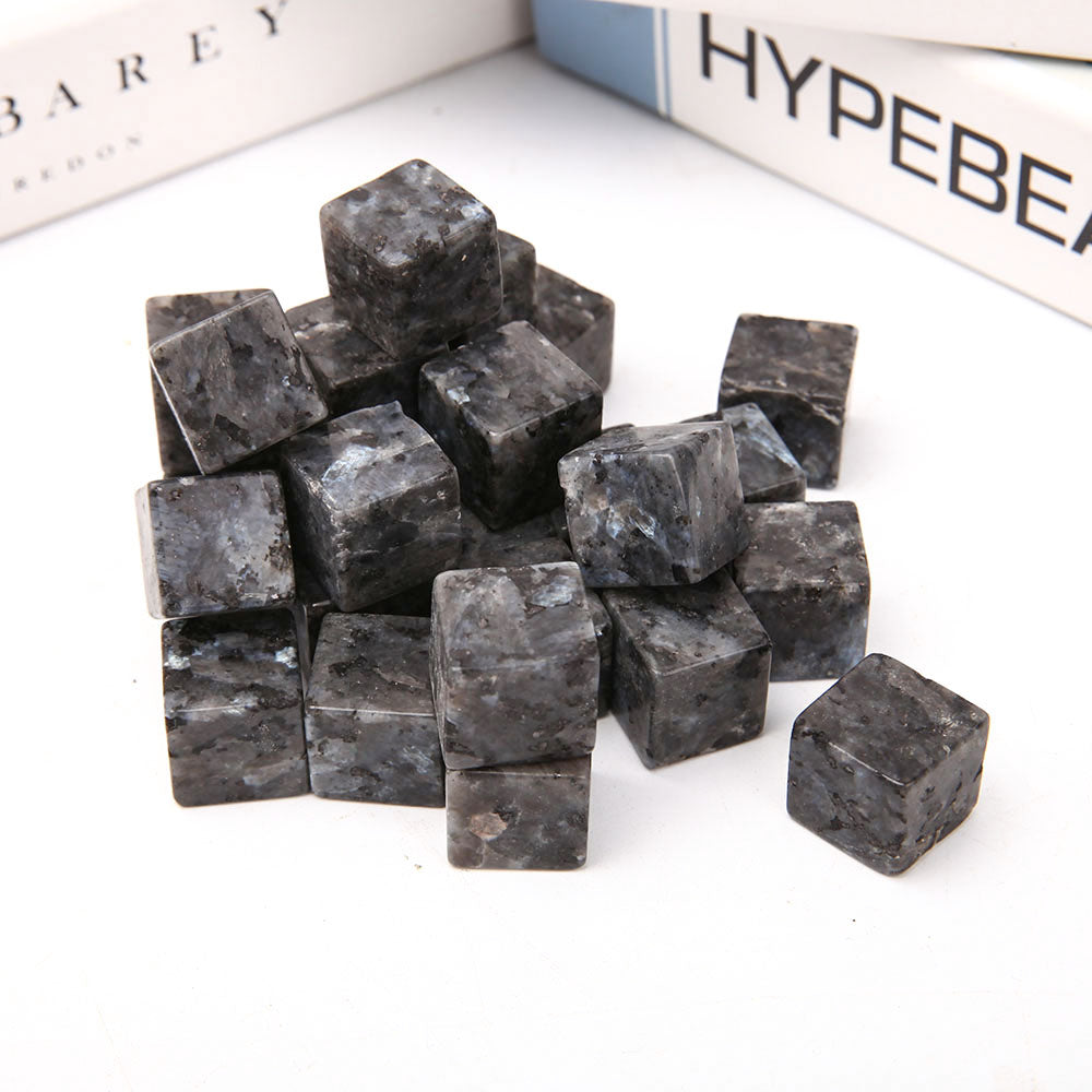 Lavikite crystal cubes are polished stones measuring approximately 1.5-2 cm (0.59-0.79 inches). They are recognized for their unique dark gray color with white and black marbling, believed to promote healing and energetic balance.