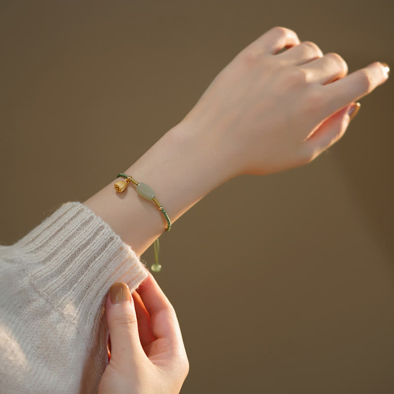 Meticulously crafted from genuine natural jade, this bracelet features the distinctive peace buckle charm and lotus bead that have been revered across cultures for centuries. The premium string band adjusts comfortably to fit most wrist sizes, making this protective jade bracelet suitable for daily wear.