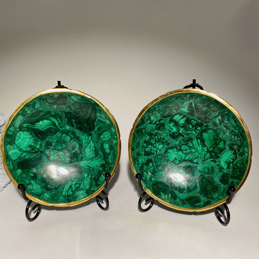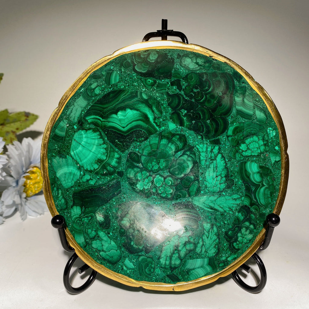 The rim features a beautiful golden metal finish that complements the natural green malachite stone. While visually striking, it is a metal coating rather than solid gold, ensuring durability and elegance.