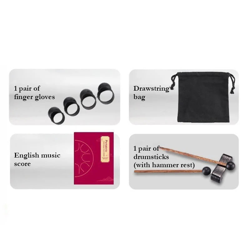 What you get: the drum, mallets, finger picks (optional playing method), music book with songs, and carrying bag. Everything needed to start playing today.