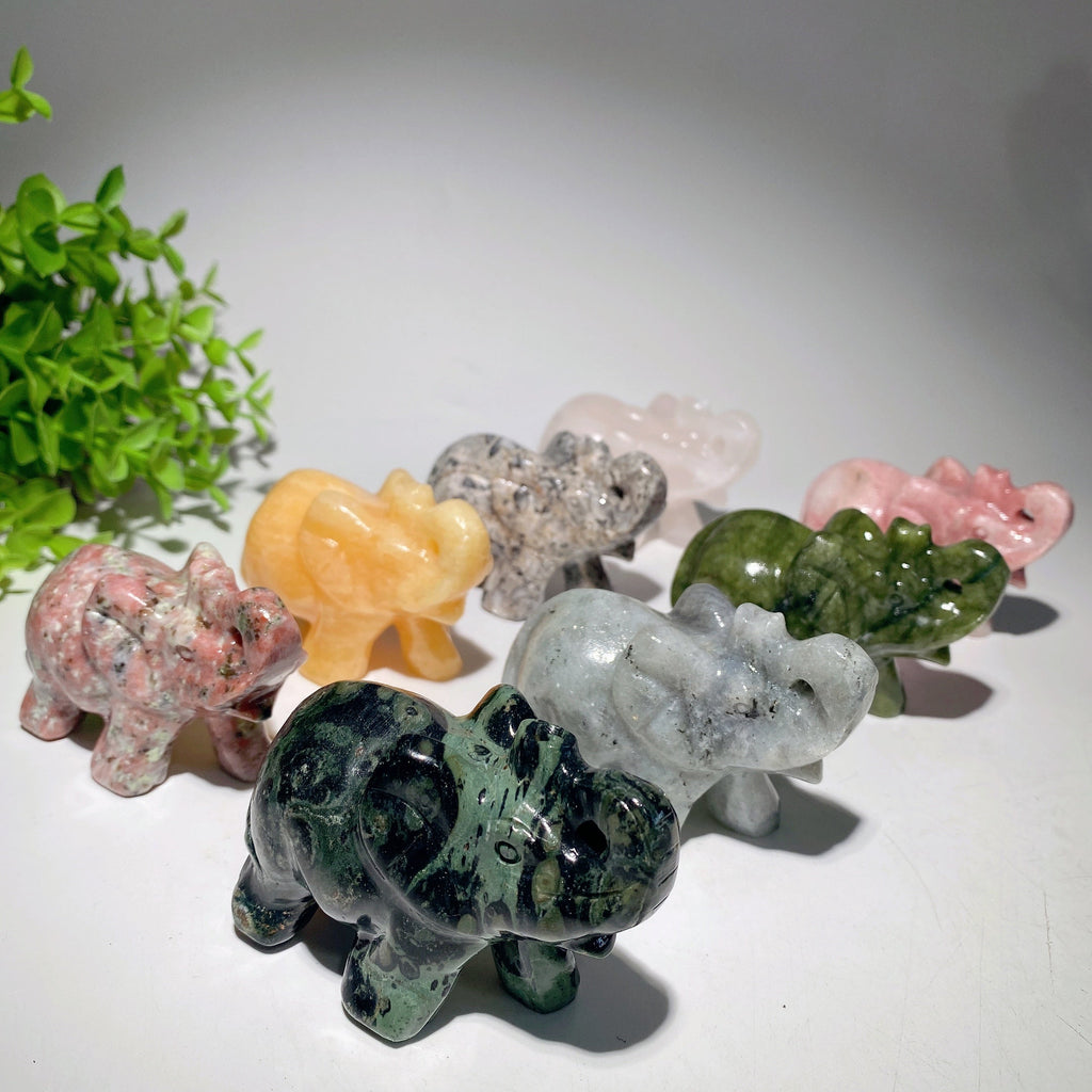These carvings combine the unique benefits of each crystal type like jade's harmony, malachite's protection, and labradorite's transformation energy. Elephants symbolize wisdom and luck.