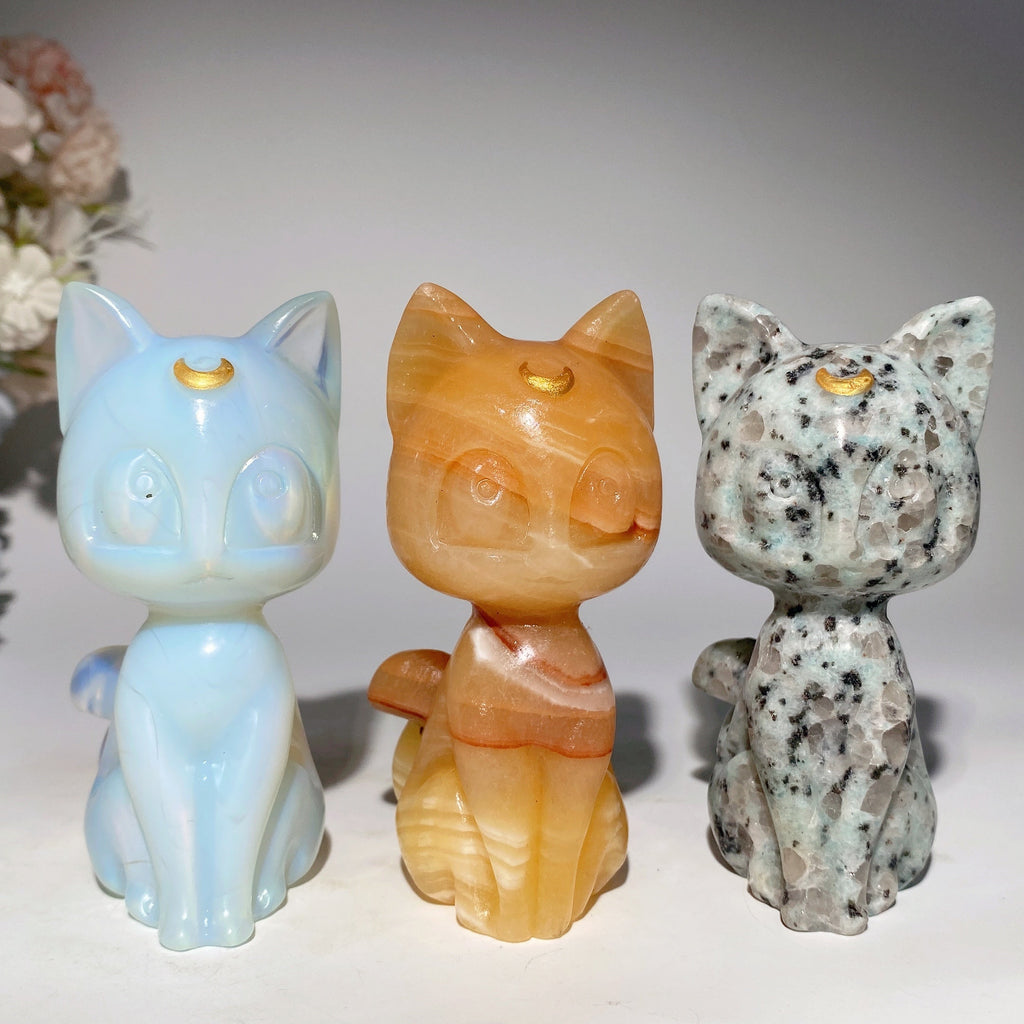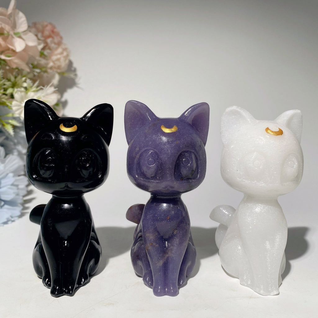 Each crystal cat carving embodies unique energies from varied gemstones like Black Obsidian and White Jade, offering protection, healing, and balance to your space.