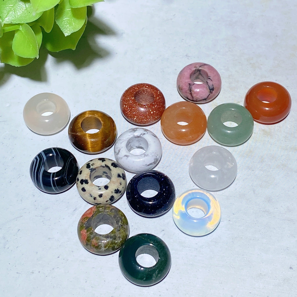 This set includes 15 mixed natural crystal donut pendants featuring a variety of polished stones such as deep red, translucent white, black with white stripes, brown, light pink with veins, speckled, and iridescent off-white tones. Each piece is uniquely beautiful and perfect for healing practices.