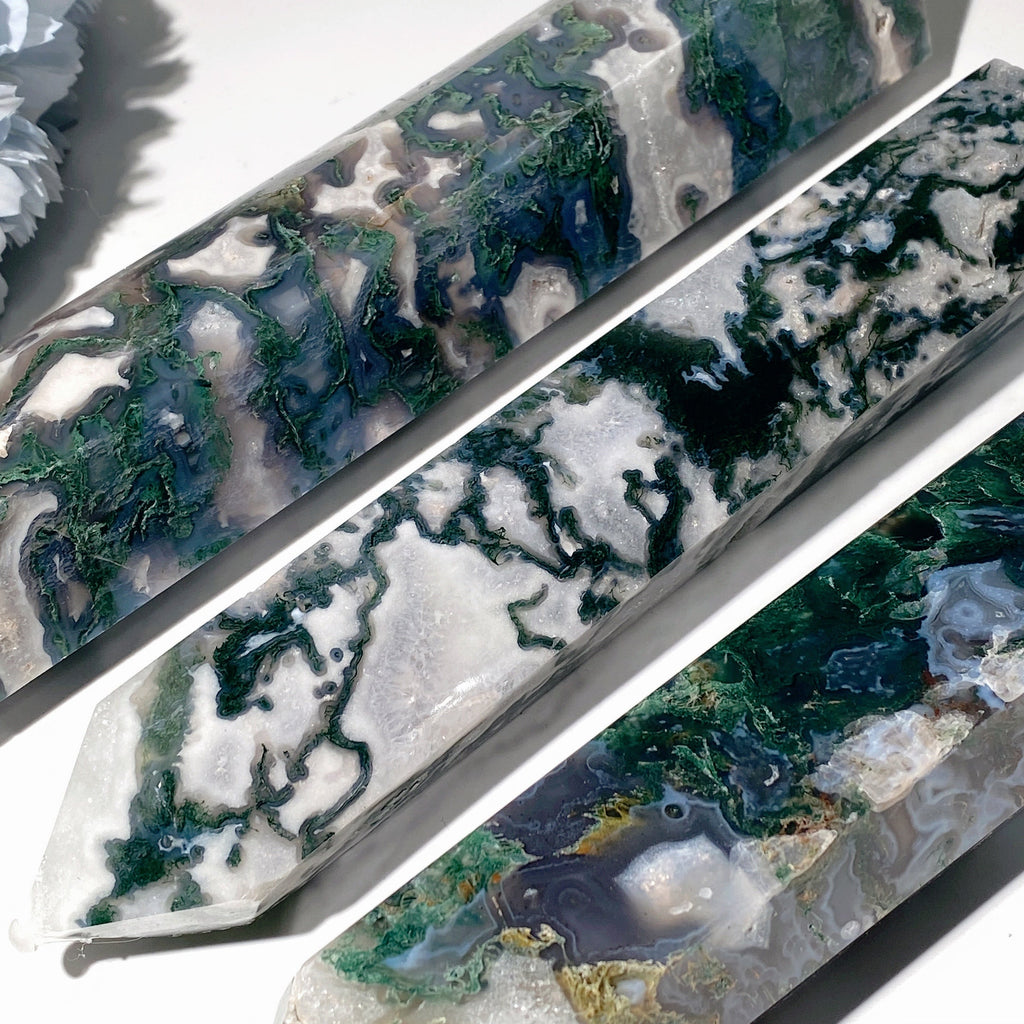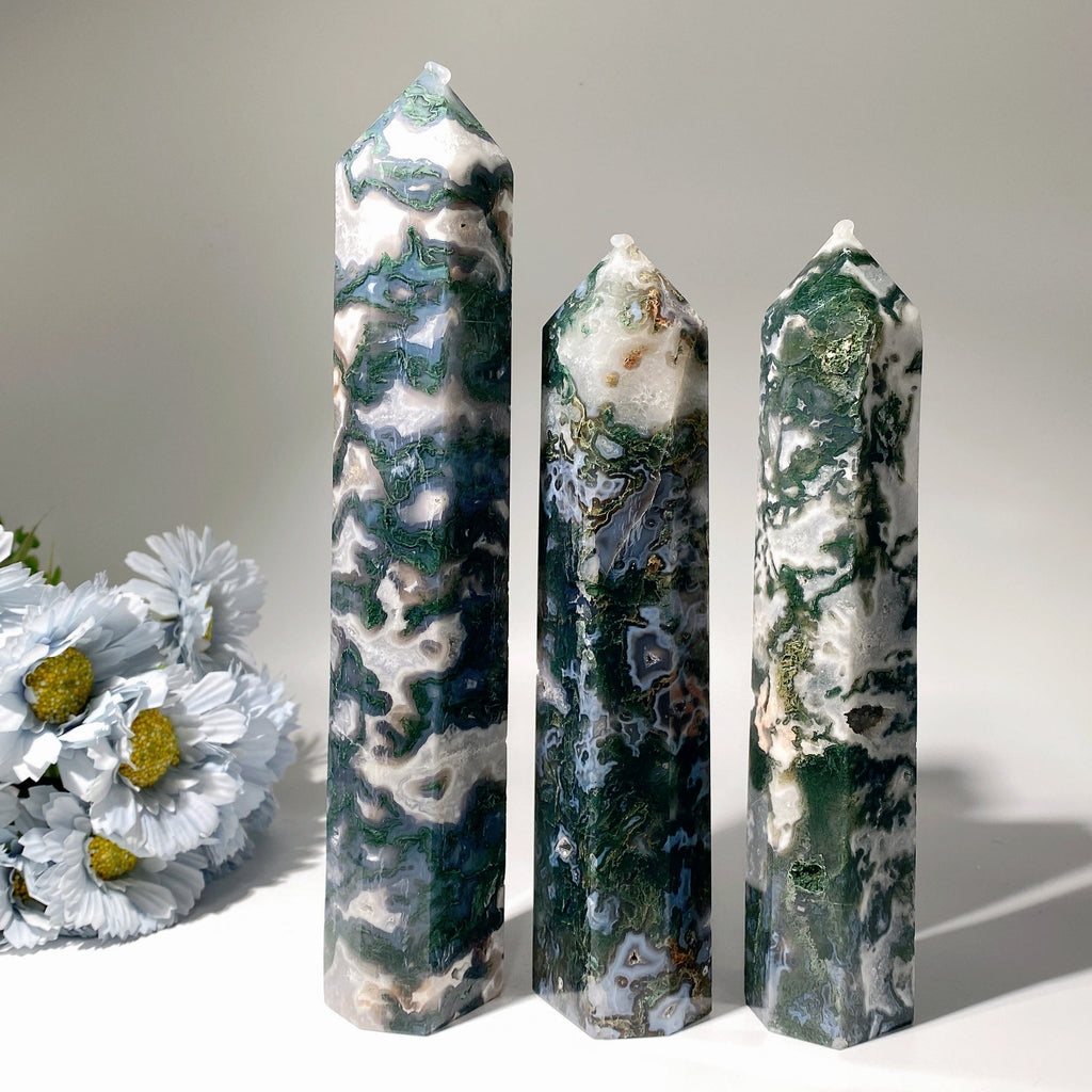 Our towers feature natural color variations typical of genuine moss agate. The polished surface and unique green tones mixed with white and gray are markers of authenticity and natural formation.