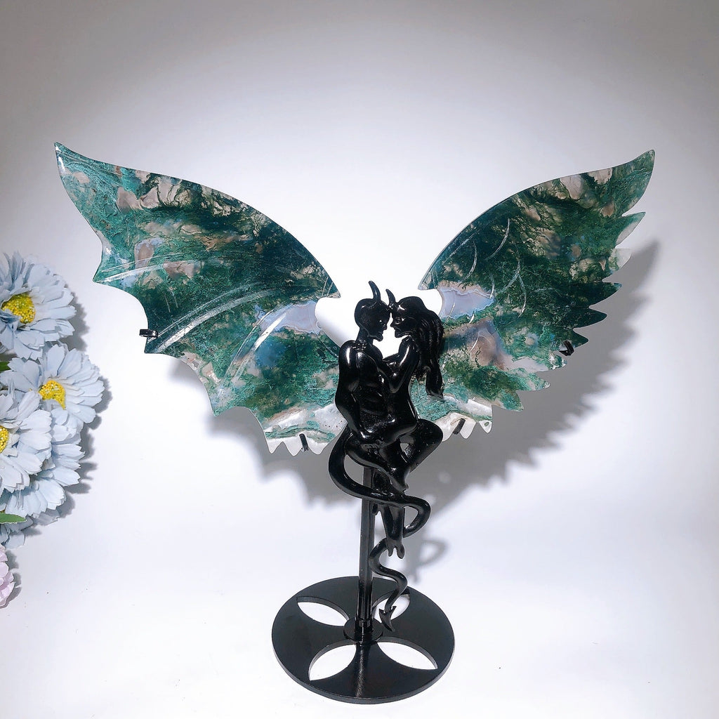 This figurine comes with a sturdy round stand that provides stability. Place it in well-lit areas to highlight the beauty of the moss agate wings and allow its healing energy to fill your space.