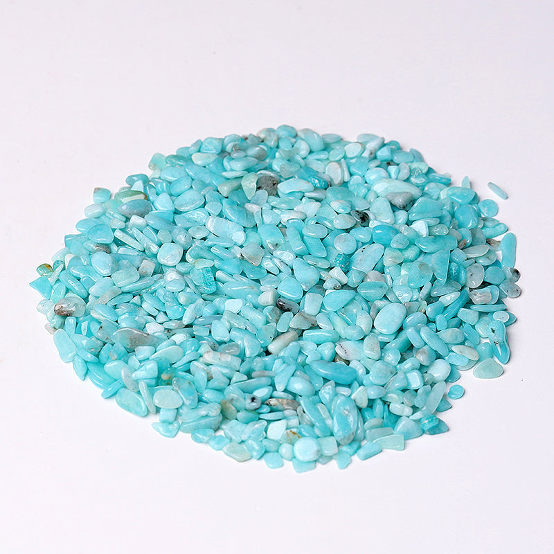 We offer two sizes of Amazonite crystal chips: 5-7mm (approx. 0.2-0.28 inches) and 7-9mm (approx. 0.28-0.35 inches), suitable for various decorative and spiritual applications.