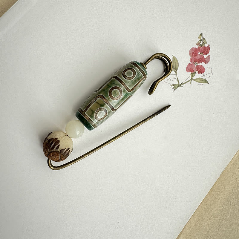 At the heart of this brooch lies the Nine-Eye Dzi bead, one of the most revered amulets in Tibetan spiritual practice. These sacred beads are believed to embody the activity of the universe and human wisdom. Each of the nine eyes represents different blessings: protection, good health, wealth acquisition, enhanced intelligence, and the purification of negative energies.