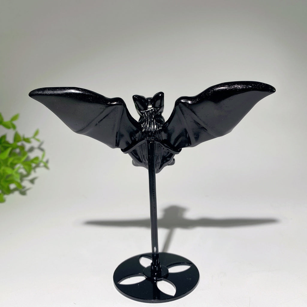 The bat carving measures approximately 4.8 inches (approx. 12.2 cm) in length, and the included stand is about 3.2 inches (approx. 8.1 cm) high, ideal for tabletop display or as a unique Halloween decoration.