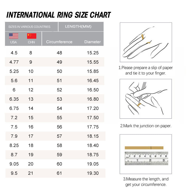 Note: To find your perfect size, measure your finger with a soft measuring tape or visit a local jeweler for sizing.