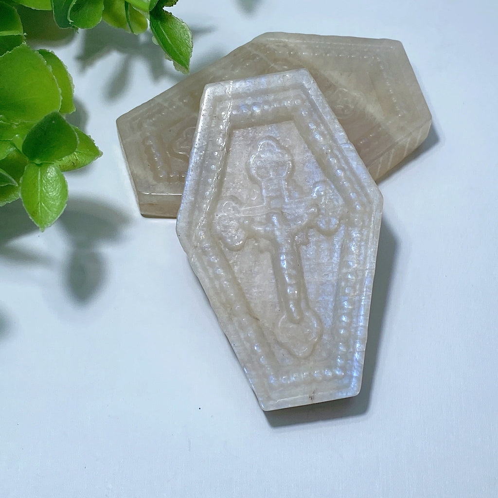 Discover the enigmatic allure of our Peach Moonstone Coffin Crystal Carving, a captivating addition to our collection of crystal shapes. This hand-carved masterpiece showcases the ethereal beauty of moonstone in an evocative coffin form, complete with a meticulously engraved cross design. The gentle peach hues create a warm, inviting energy while maintaining the stone's characteristic luminous glow.