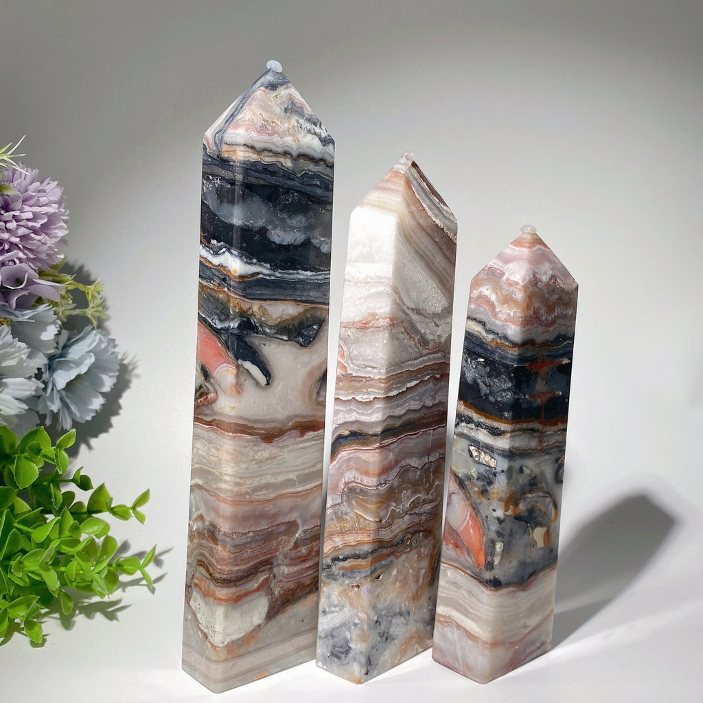 Discover the captivating beauty of our Pink Black Crazy Agate Crystal Tower for healing spaces and meditation practices. These striking crystal towers showcase nature's artistry through their distinctive banding patterns of pink, black, beige, and white. Each tower stands as a testament to the earth's geological wonders, offering both aesthetic appeal and energetic benefits.
