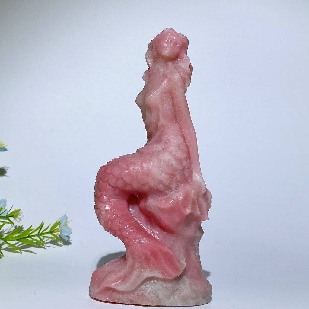 The Pink Jade Mermaid Figurine measures approximately 6.9 inches (approx. 17.5 cm) tall and 3.6 inches (approx. 9.1 cm) wide. Its medium size makes it perfect for both display and spiritual work in your home or office.