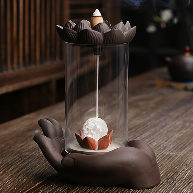 This incense burner is crafted from purple clay, ceramic, and acrylic. These materials ensure durability, an elegant finish, and an environmentally friendly, handmade quality that enhances its spiritual presence.