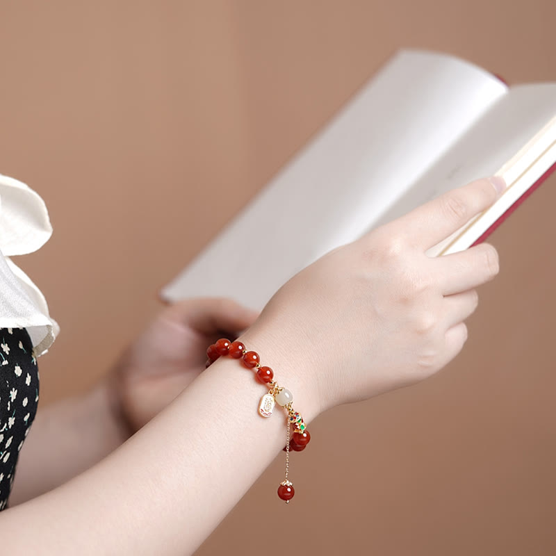 The bracelet offers confidence, calm, and promotes positivity and good fortune, inspired by both the natural properties of red agate and the symbolic Fu character representing happiness and blessing.