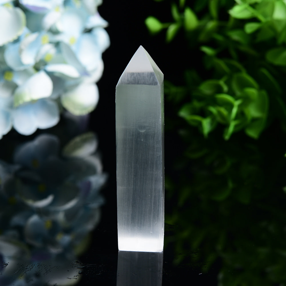 The selenite crystal tower, standing approximately 3.0 to 3.3 inches (7.6 to 8.4 cm), is known for its high-vibration energy that promotes healing and energy cleansing. It supports meditation, helps clear negative energy, and encourages spiritual growth, making it a beautiful addition to your sacred space.