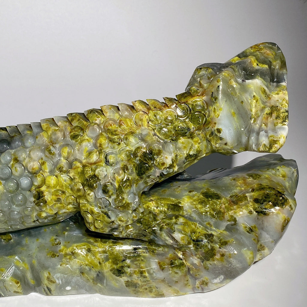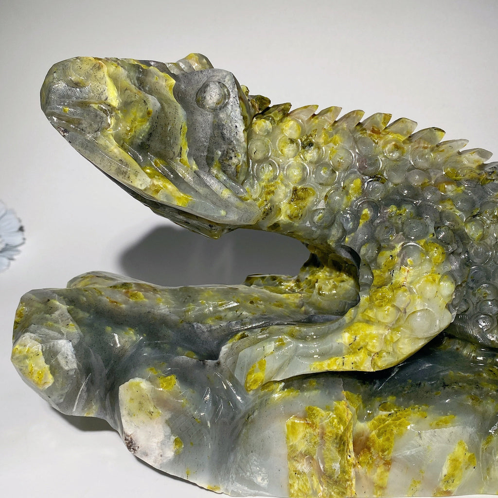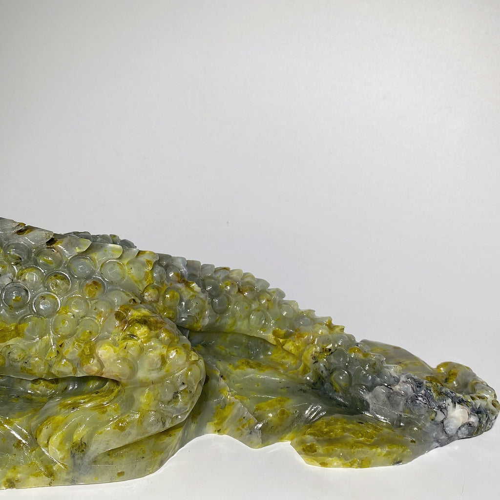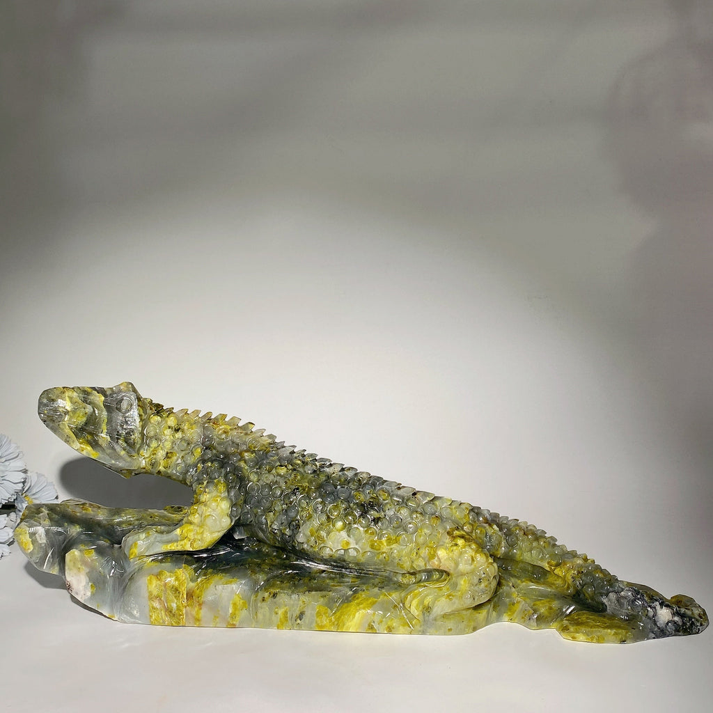 The large serpentine lizard carving is crafted from natural serpentine stone, known for its soothing energy. It is believed to aid in emotional balance and spiritual healing, providing a calm presence and encouraging positive transformation in your space.