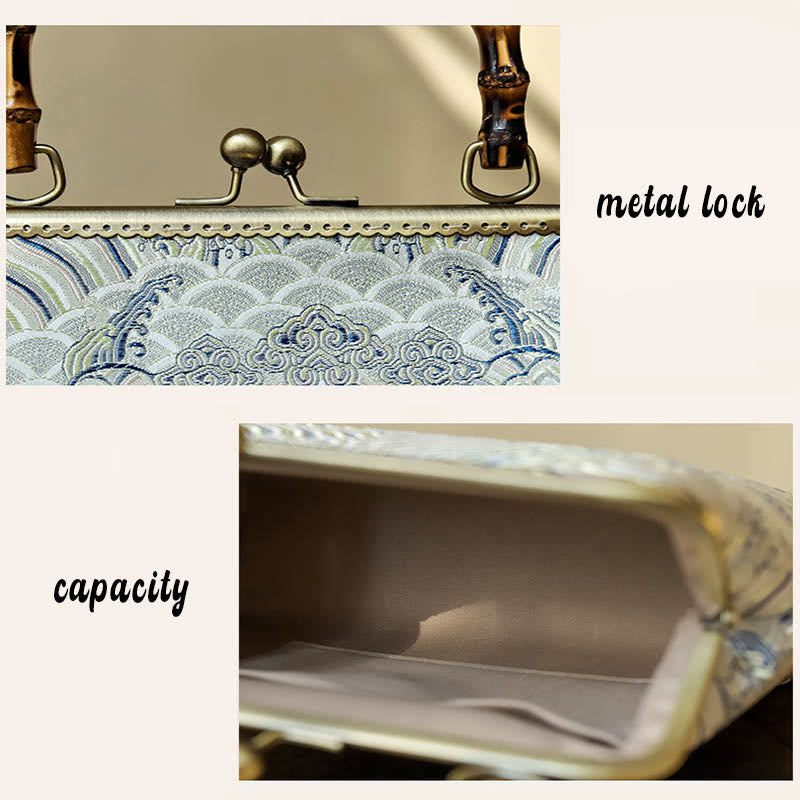 Crafted with intention, this crossbody bag celebrates the marriage of natural bamboo and shimmering silver lines that create visual harmony. The bamboo handle represents growth, flexibility, and sustainability—values deeply connected to spiritual practice. Its elegant proportions (26cm width × 20cm height × 7cm depth) offer practical space while maintaining a sleek silhouette that complements both everyday casual wear and more formal occasions.