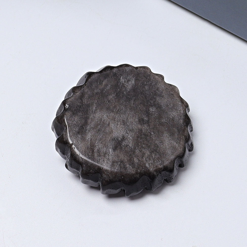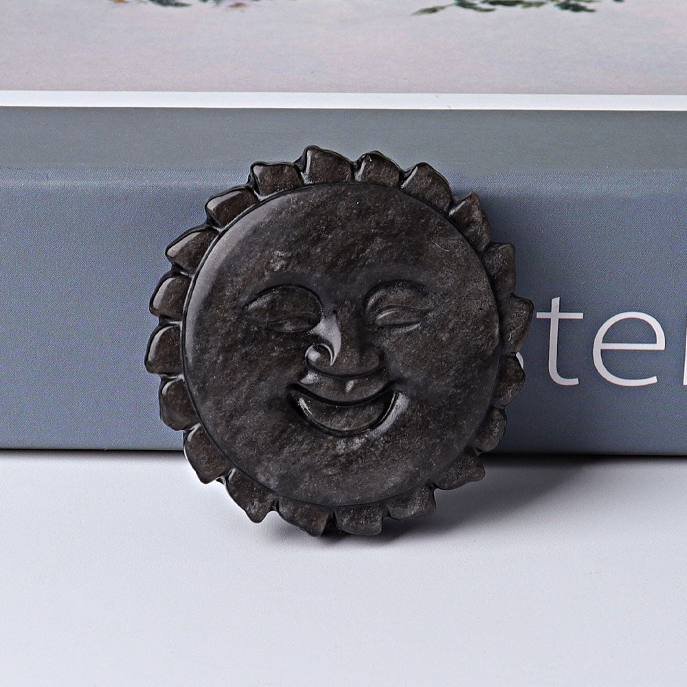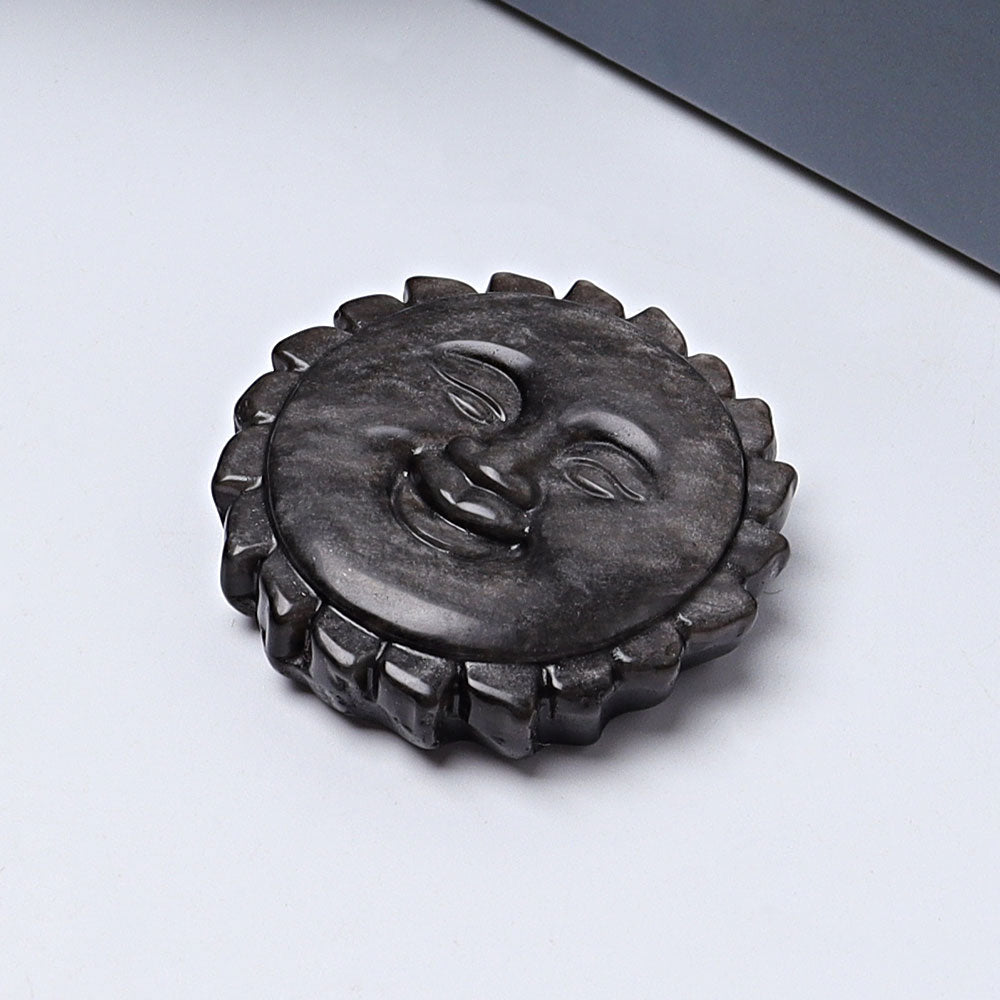 The silver obsidian sun face figurine is believed to promote protection and positive energy. Its sun motif symbolizes vitality and joy, making it a meaningful piece for meditation and healing practices.