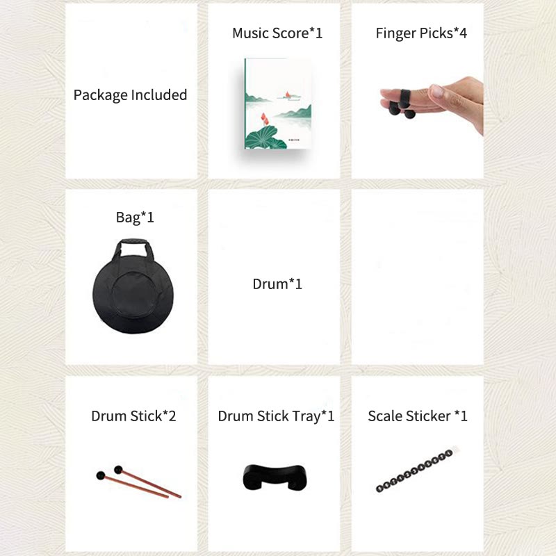 - Package Includes: Manual, Scale Sticker, 2 Drum Sticks, Tray, Bag, Drum, 4 Finger Picks