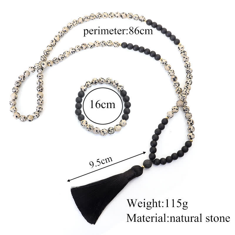 This mala comes as a bracelet with a wrist circumference of 5.9-7.5 inches (approx. 15-19 cm) and a necklace length of 33.9 inches (approx. 86 cm). Both are made with durable elastic string to comfortably fit most sizes.